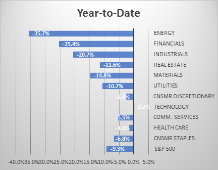 To help put the dichotomy of returns into perspective, the chart below depicts returns, by sector, for the S&P 500 year to date¹.