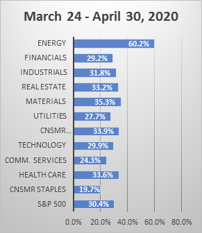 Looking at these results differently, we show how sector returns have varied during the initial downturn from February 20th to March 23rd of this year. The second chart shows sector returns from the relief rally we’ve experienced from March 24th through April 30th.