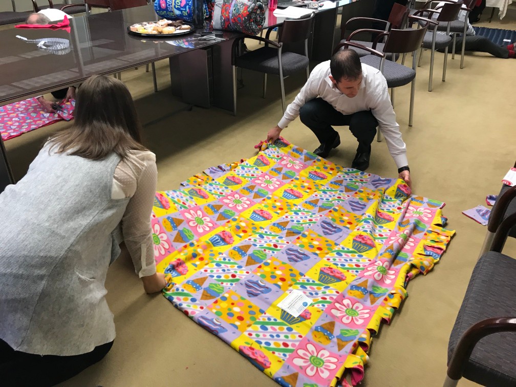 Employees create 25 unique blankets and video messages of support via the organization Fleece & Thank You