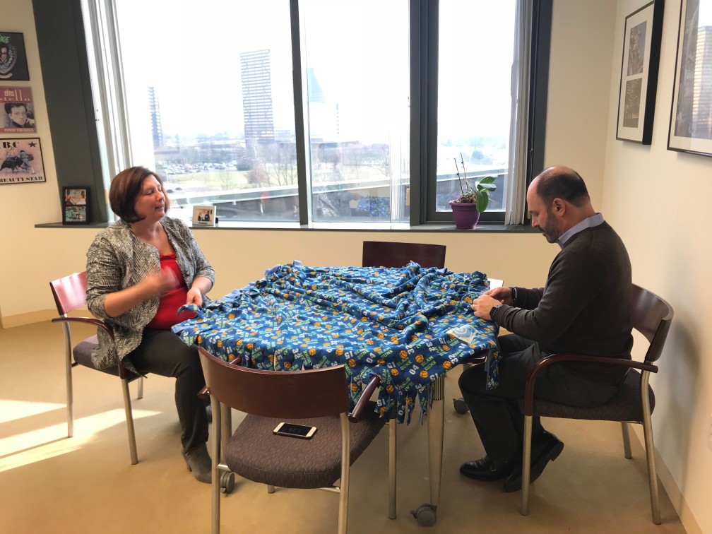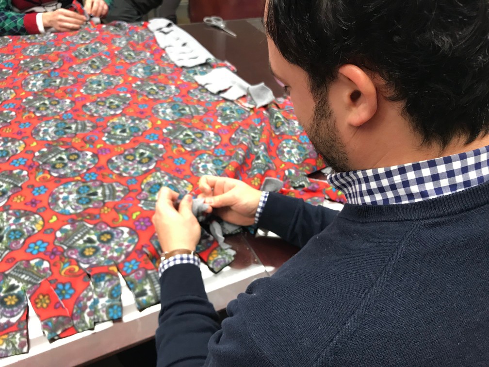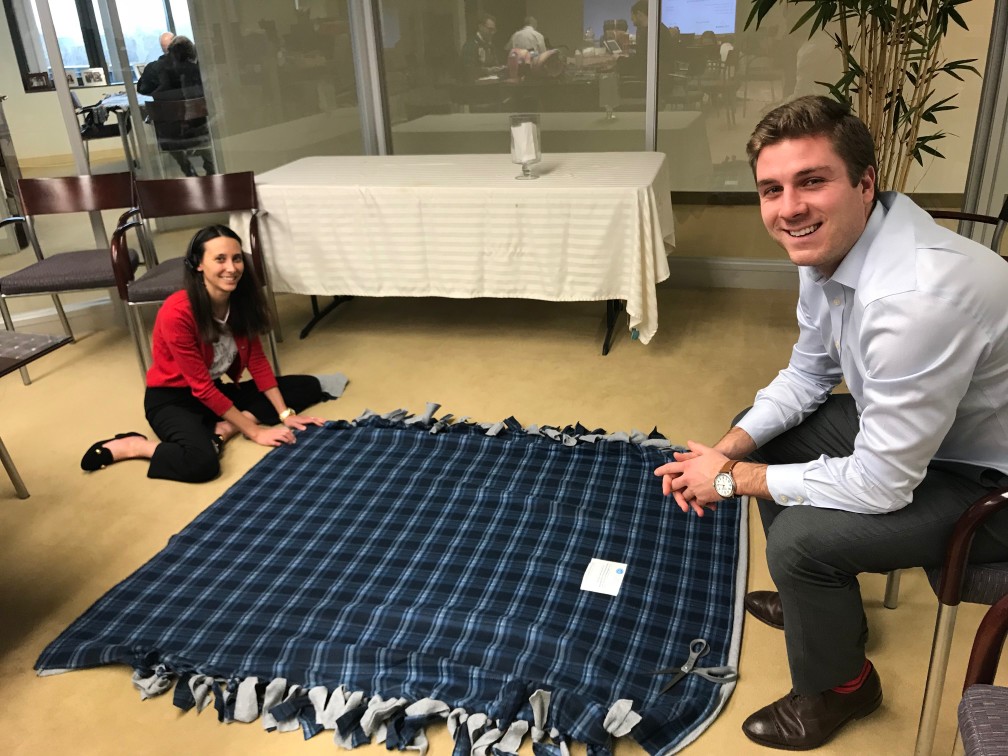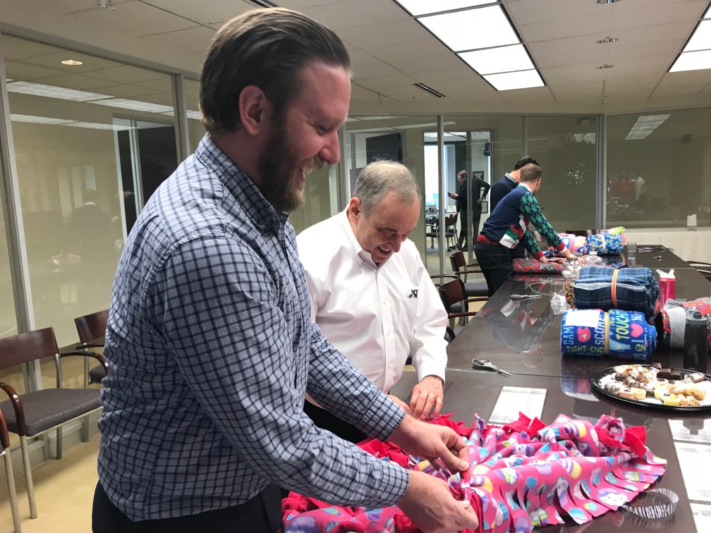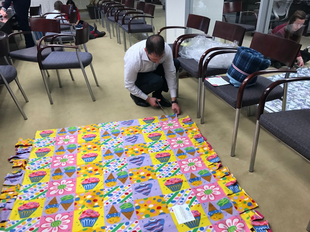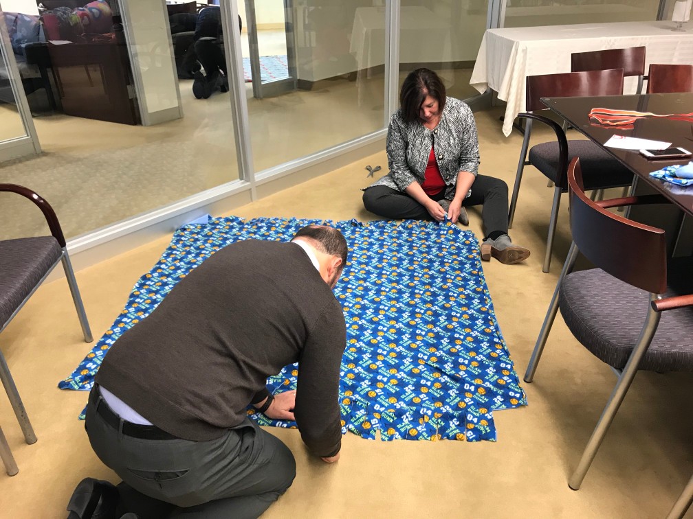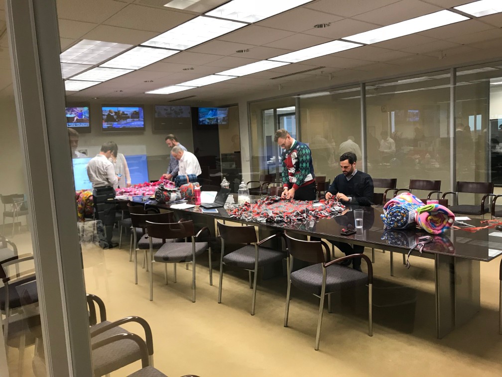 With the kits at the ready, the Telemus team got to work one cold December afternoon. Employees teamed up in groups of two, working together to line up a patterned fleece blanket perfectly on top of a solid one. Then, they used scissors to snip strips every few inches around the edges, before tying one knot at a time around the entire perimeter. One by one, each blanket was completed.